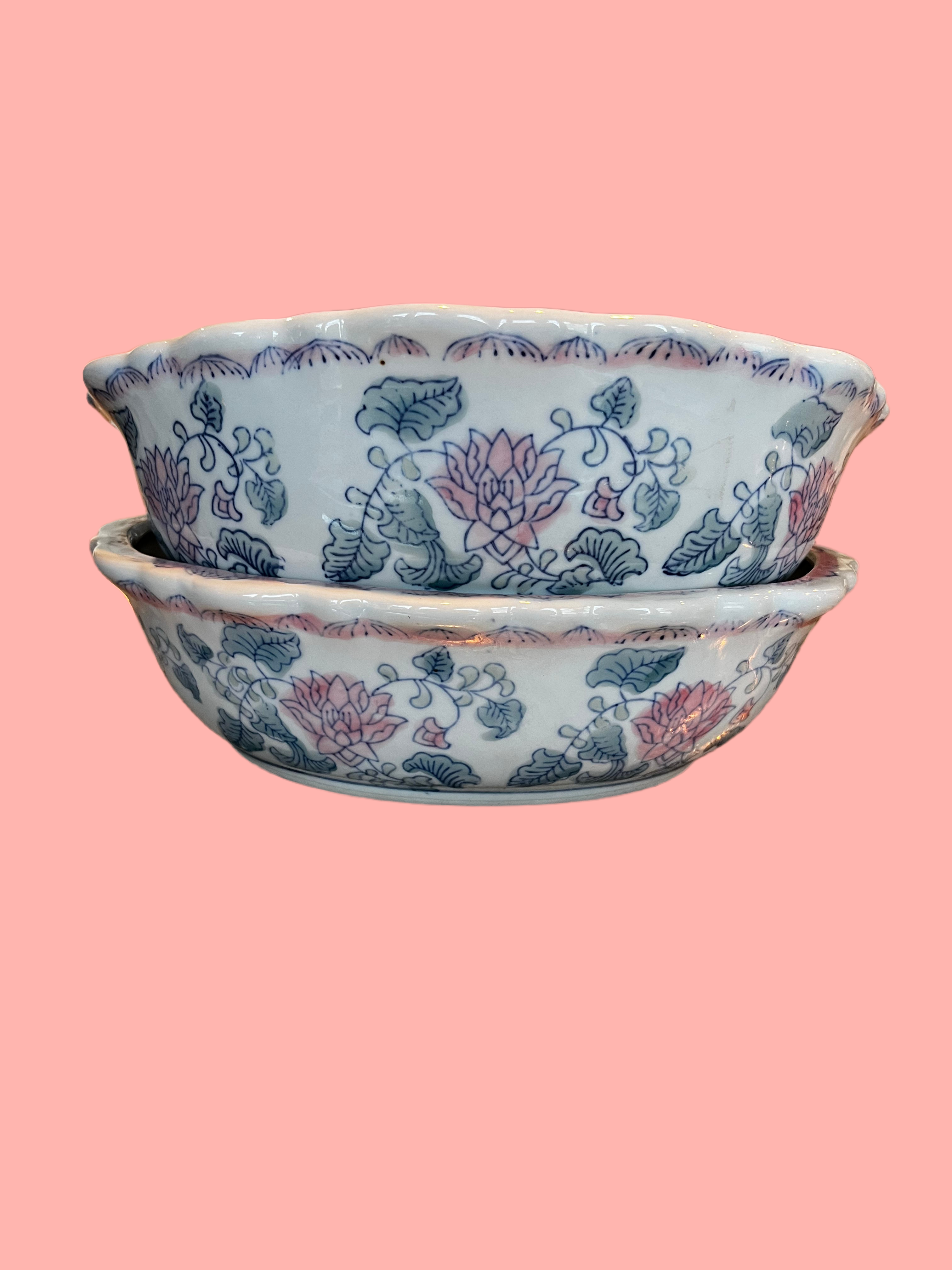 These vintage bulb bowls check every box for me!! I love the soft aqua, blue and pink colors. These are all hand decorated with repeating panels of flowers and branches plies each bowl has a darling pink scalloped rim!!