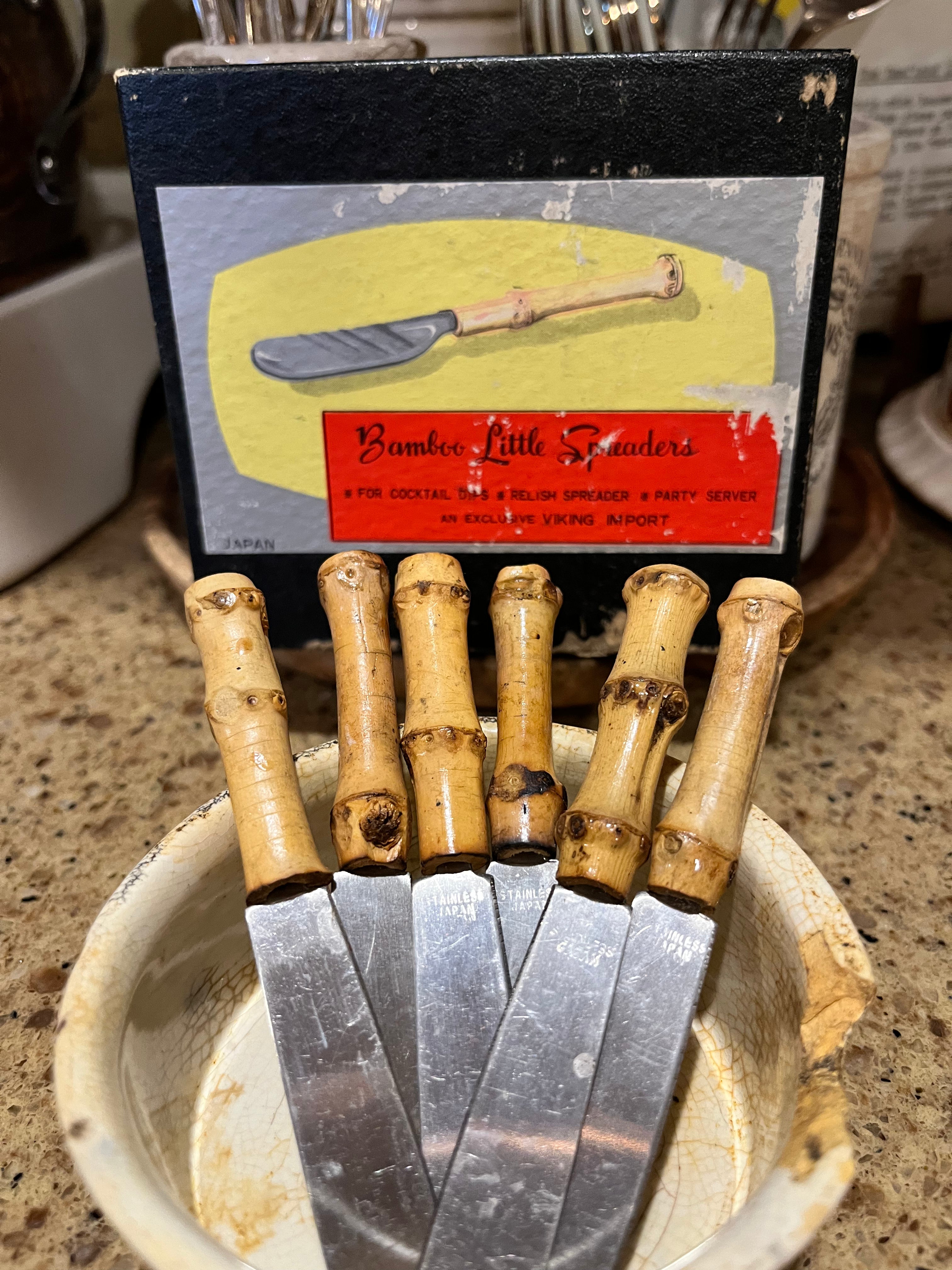 Here’s a darling set of 6 vintage bamboo little spreaders in their original box! They measure 5” long and are in excellent condition!